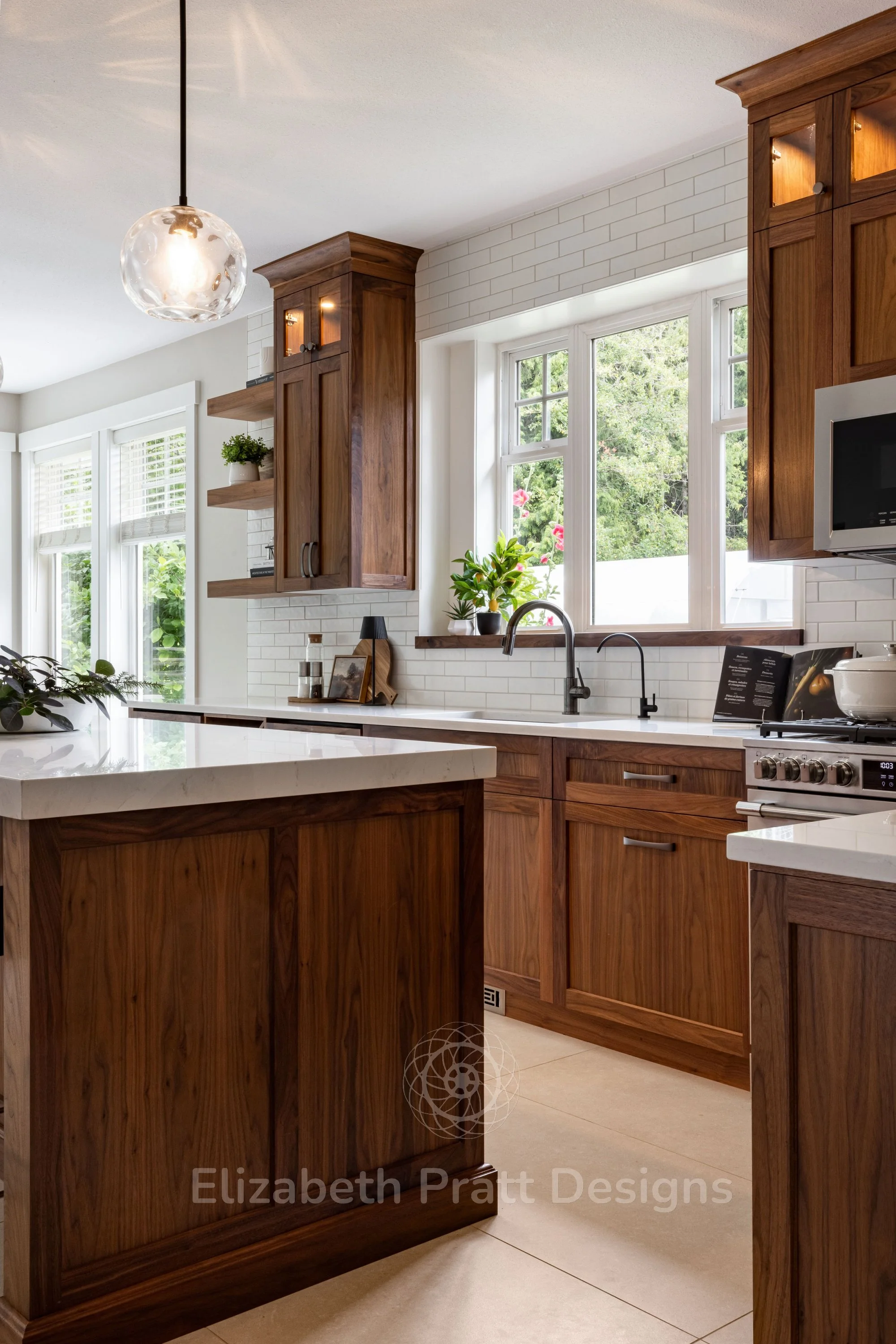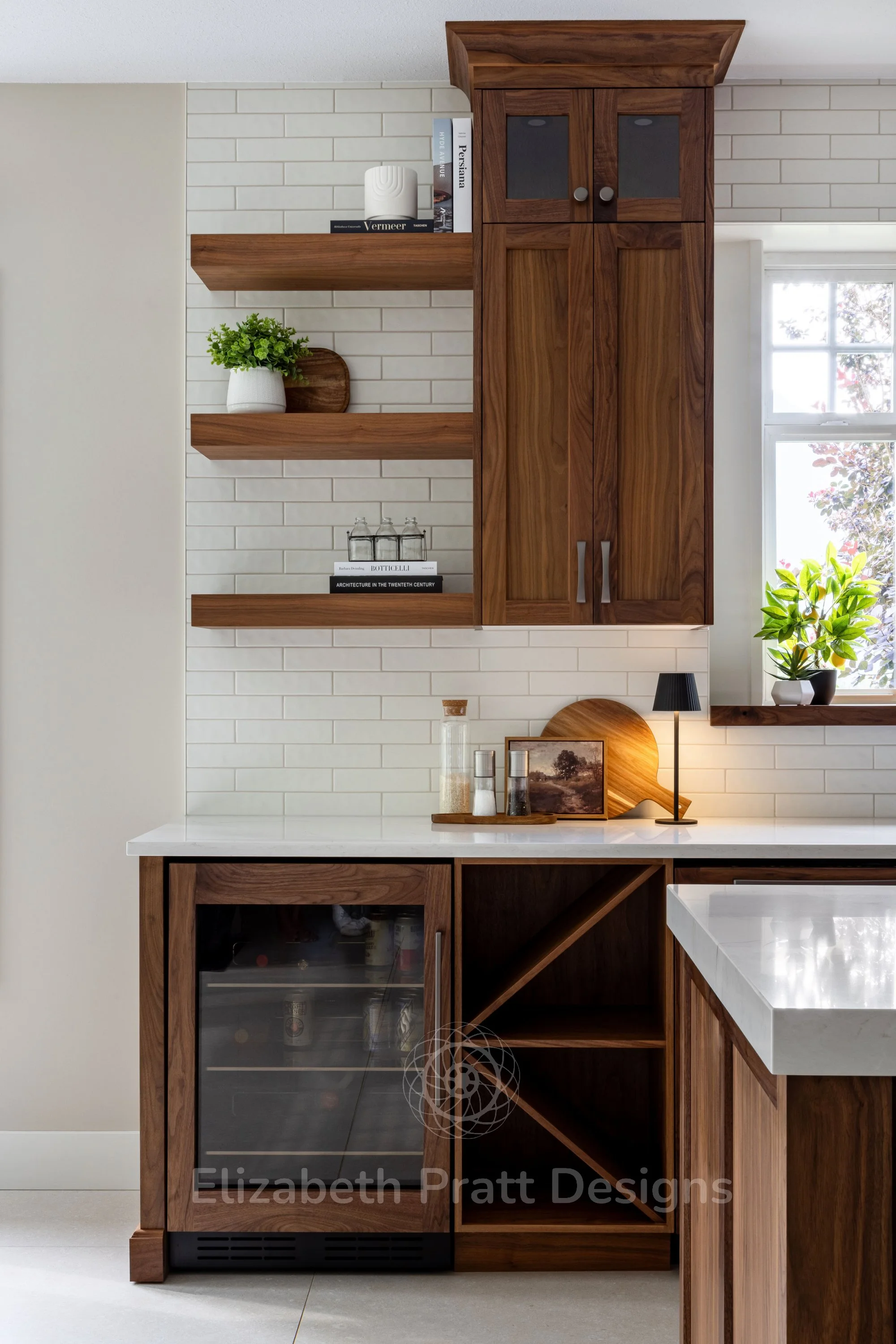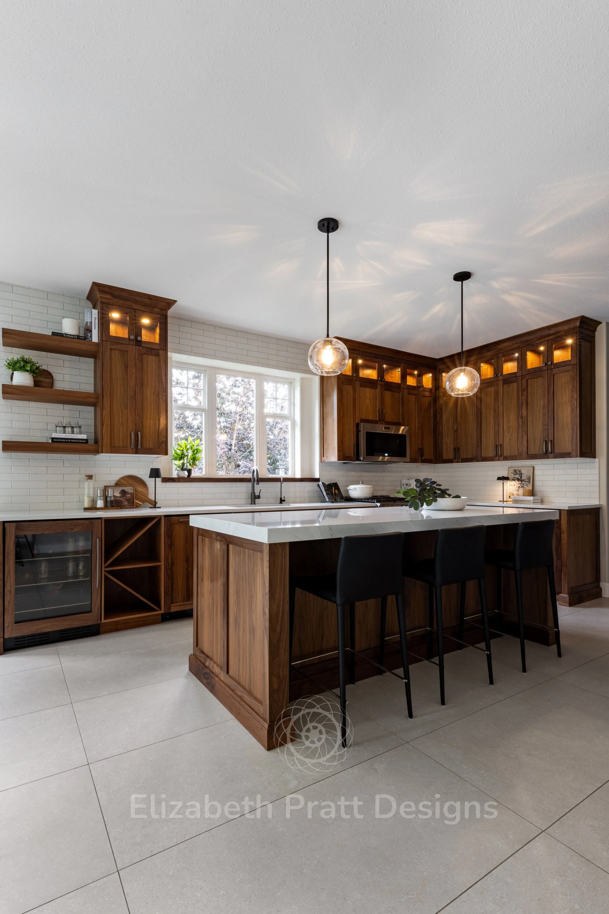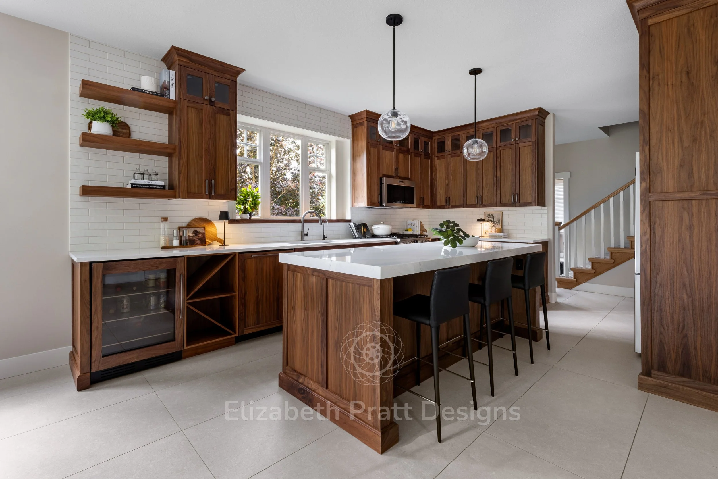 The design focused on authenticity and attention to detail. Black walnut cabinetry provides rich, natural warmth, complemented by hand-scraped tile for the backsplash, adding texture and character. Custom-selected handles brought a subtle, refined touch, showing that even the smallest details matter. The interior remains uncluttered, with minimal furniture, including sleek bar stools that let the materials and architectural details shine.