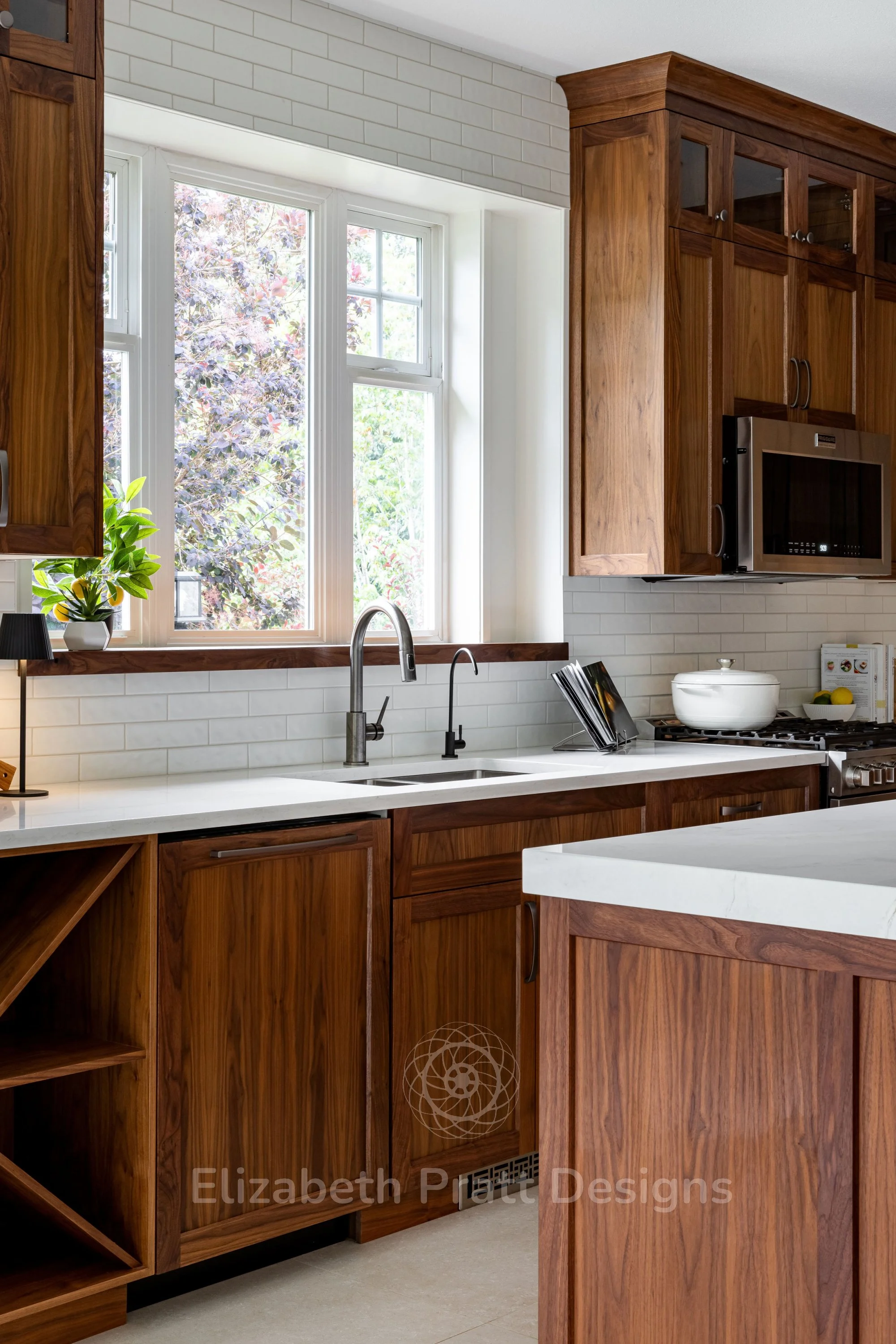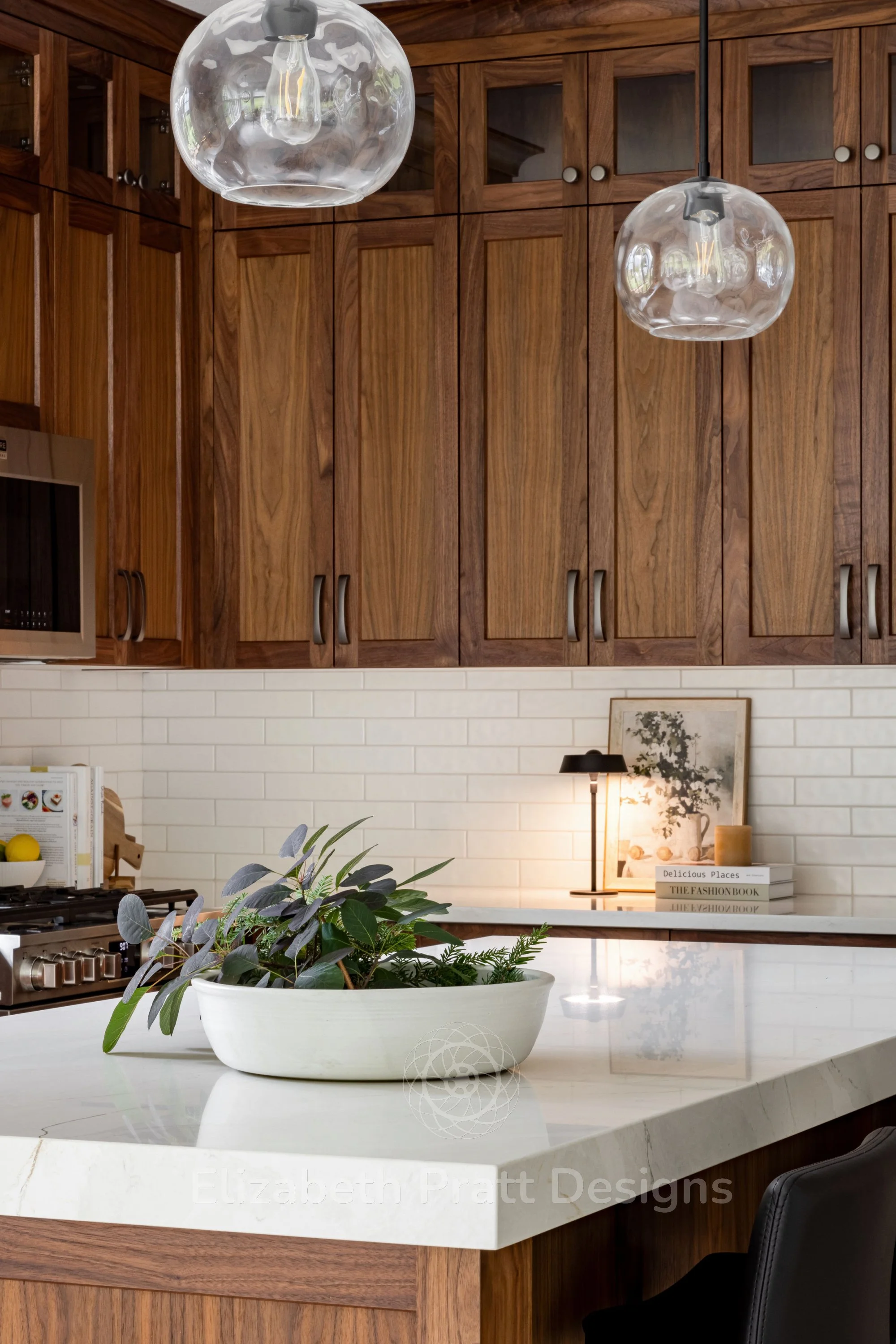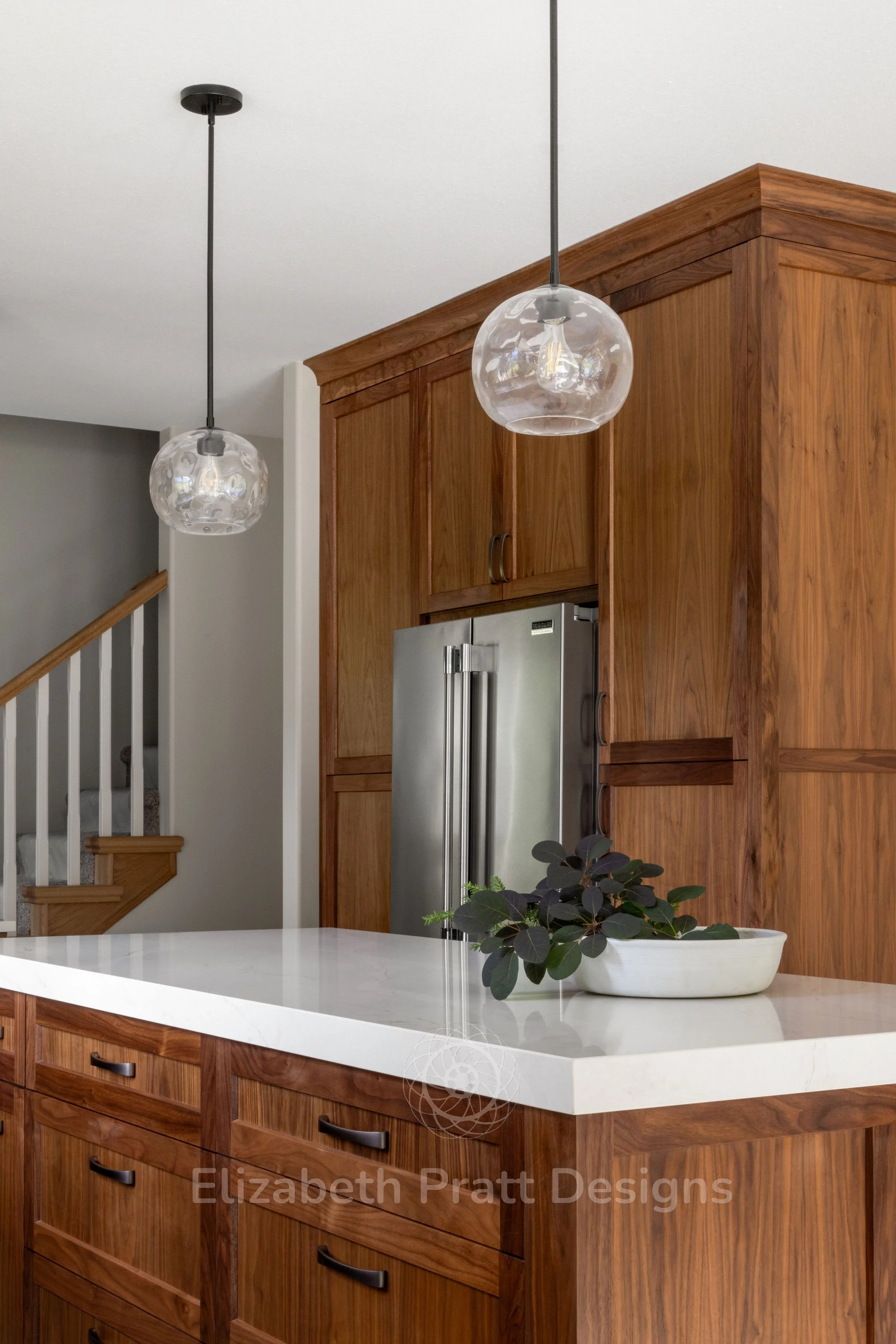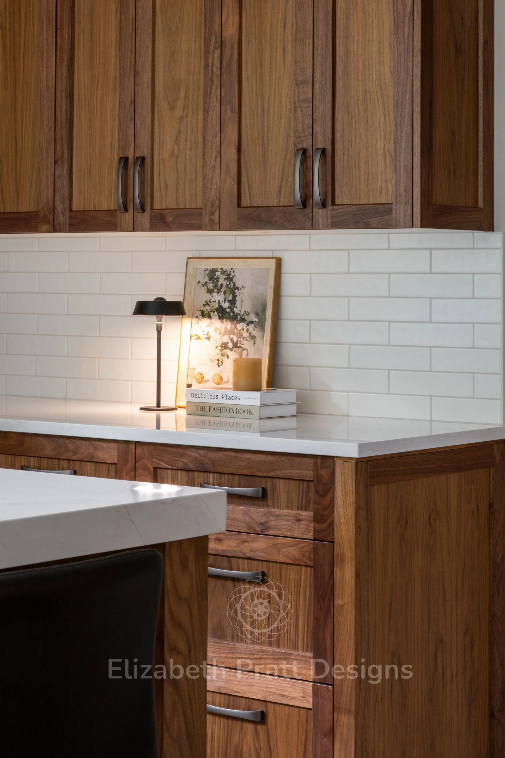 The design focused on authenticity and attention to detail. Black walnut cabinetry provides rich, natural warmth, complemented by hand-scraped tile for the backsplash, adding texture and character. Custom-selected handles brought a subtle, refined touch, showing that even the smallest details matter. The interior remains uncluttered, with minimal furniture, including sleek bar stools that let the materials and architectural details shine.