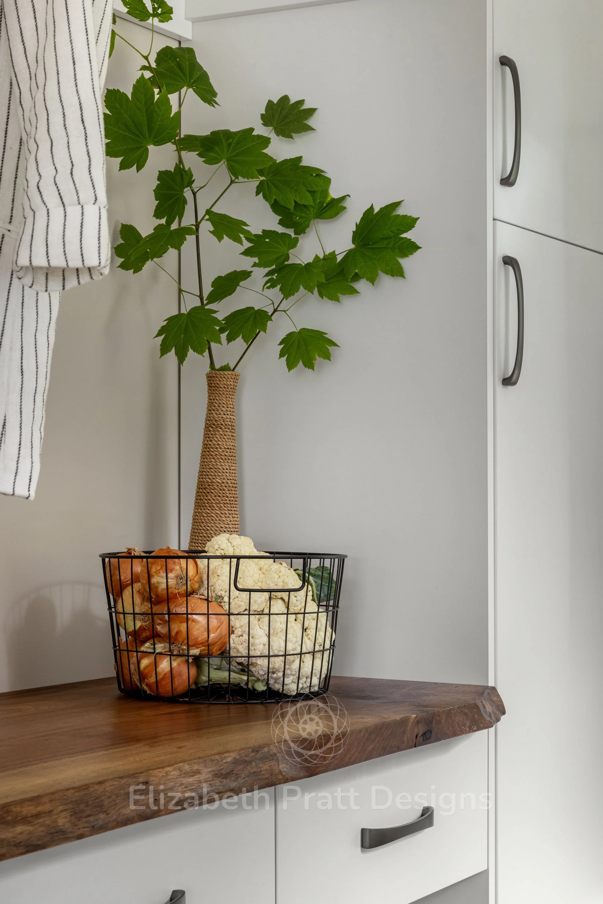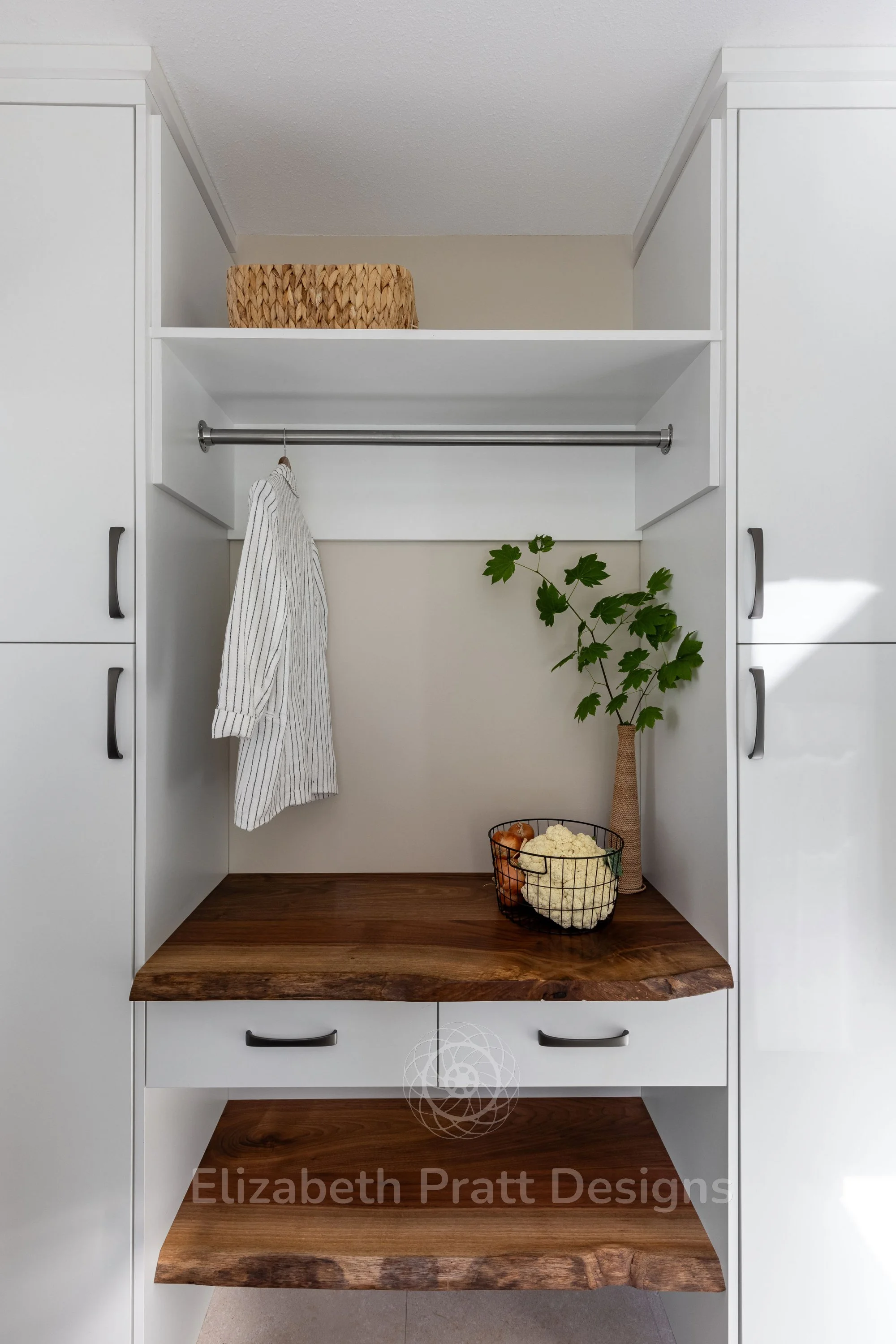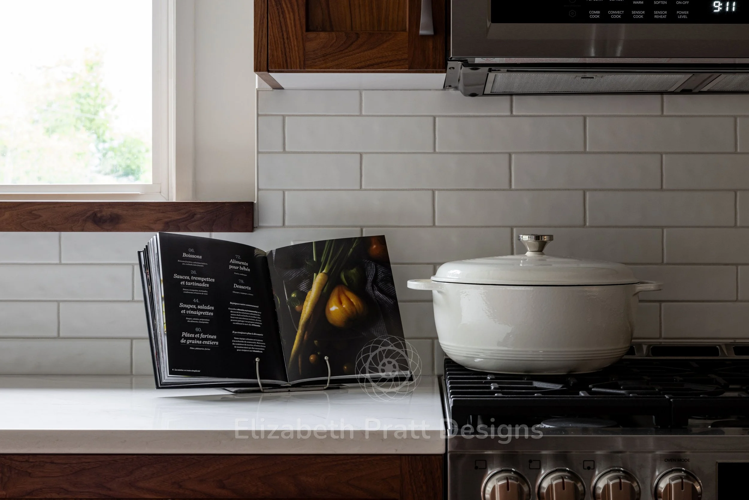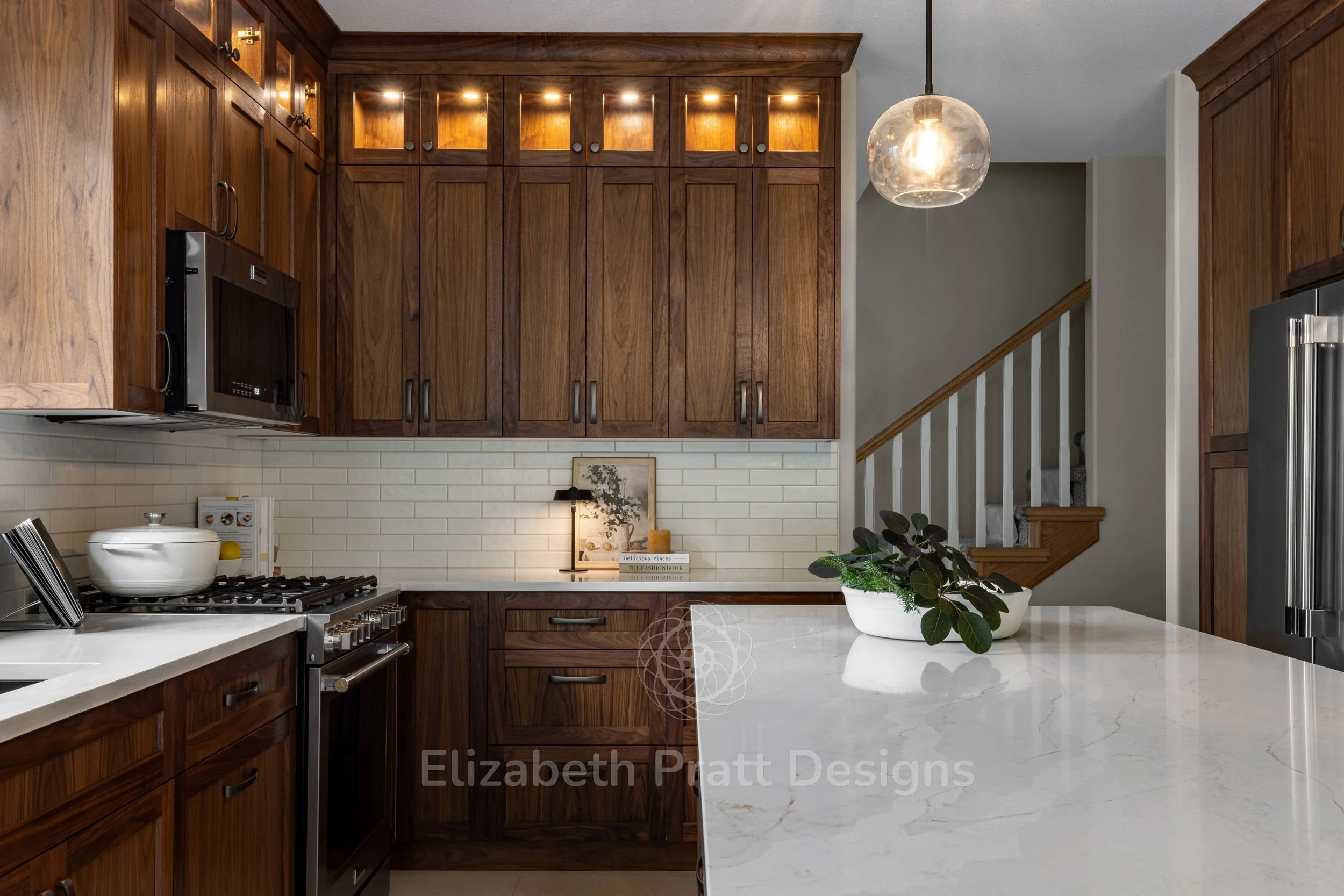 The design focused on authenticity and attention to detail. Black walnut cabinetry provides rich, natural warmth, complemented by hand-scraped tile for the backsplash, adding texture and character. Custom-selected handles brought a subtle, refined touch, showing that even the smallest details matter. The interior remains uncluttered, with minimal furniture, including sleek bar stools that let the materials and architectural details shine.